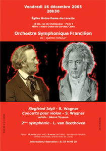 Weit nachhaltiger in der Wirkung einer Aufführung dieser Komposition am 16. Dezember 2005 in Paris. Das Orchestre Symphonique Francilien umrahmte sie mit Richard Wagners »Siegfried-Idyll« und Beethovens Zweiter. Das Orchester, mit ausnahmslos jungen Instrumentalistinnen und Instrumentalisten, ging in der Èglise Notre-Dame-de-Lorette, unweit der Opéra Garnier, hoch motiviert, mit großer Spielfreude und Begeisterung ans Werk. Der blutjunge Dirigent Quentin Hindley ließ bereits beim »Siegfried-Idyll« alle Erdenschwere und Götterwelt des »Ring« weit hinter sich und deutete Richard Wagners häusliche Komposition als ein mediterranes Farbenspiel, darin verwandt der Interpretation des Dirigenten Siegfried Wagner, wie sie uns Tonträger erhalten haben. In Siegfried Wagners VIOLINKONZERT machte Hendley die Nähe seiner Lesart zu Debussy und zur französischen Musik deutlich, hier standen Debussy und Magnard gewissermaßen Pate, aber auch der Weg zur Minimal Music eines John Adams leuchte unmissverständlich auf. Tatsächlich ist jenes perpetuierende Ringen um die Tonika, das Gülke gestrichen hat, im Lichte unserer Erkenntnis als ein Vorgriff auf minimalistische Techniken zu verstehen. So rasant, wie die 26-jährige, japanisch-deutsche Französin Akémi Toyama-Mehlem den Solopart (in Siegfried Wagners Originalversion, also nicht in der Einrichtung von Henri Marteau) exerziert, hat man diesen Kampf des Individuums gegen eine konformistische Gesellschaft zuletzt von Peter Zazofsky 1986 in Berlin gehört – nur dass damals mit Heinrich Hollreiser ein Altroutinier das mitgerissene Orchester mäßigte, während in Paris ein genialischer Jungdirigent die Wogen hoch aufbranden ließ. Ein trefflicherer symphonischer Abschluss des Gedenkjahres zum 75. Todestag Siegfried Wagners war kaum denkbar: Das Ereignis in der französischen Metropole, dessen Management in den Händen unseres ISWG-Mitglieds Evelyne Lubert lag, soll Fortsetzungen erfahren.