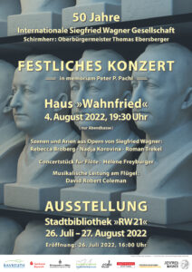 Am 4. August 2022 lädt die ISWG anlässlich Siegfried Wagners Todestags zunächst zu einem Gedenken an der Grabstätte auf dem Bayreuther Stadtfriedhof ein (17:00 Uhr); am Abend desselben Tages findet in Haus »Wahnfried« ein Festliches Konzert – in memoriam Peter P. Pachl – statt. Auf dem Programm stehen Szenen aus HERZOG WILDFANG (op. 2, 1900), DER KOBOLD (op. 3, 1903), STERNENGEBOT (op. 5, 1906), DER SCHMIED VON MARIENBURG (op. 13, 1923) und DIE HEILIGE LINDE (op. 15, 1927) sowie das CONCERTSTÜCK FÜR FLÖTE. Rebecca Broberg, Nadja Korovina, Roman Trekel und Hélène Freyburger werden an Richard Wagners Steinway-Flügel begleitet von David Robert Coleman.