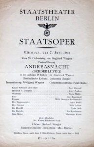 Die Andreasnacht steht im Mittelpunkt der Oper BRUDER LUSTIG von Siegfried Wagner, die ja auch unter dem Titel »Andreasnacht« am 7. Juni 1944 an der Berliner Staatsoper inszeniert wurde; diese Aufführung war übrigens das Regiedebüt von Wolfgang Wagner – und zugleich die letzte szenische Realisierung des Werkes bis zur Aufführung am Stadttheater Hagen. In der Nacht zum 30. November gedenken die katholischen Christen des fischenden Apostels Andreas, Bruder des Simon Petrus. Er galt nach Jesu Tod als einer der Hauptverkünder des christlichen Glaubens in Kleinasien, Griechenland und vor allem Russland, dessen Schutzpatron er ist. Seinen Tod fand er Mitte des ersten Jahrhunderts in Griechenland an einem schrägen, x-förmigen Kreuz, dem »Andreaskreuz«, das heute noch an Bahnübergängen zu sehen ist. Er ist der Schutzpatron der Fischer und Fischhändler, aber auch – und in erster Linie – der Liebenden, und gilt als zuständig für Eheglück, Kindersegen und Eheanbahnung. Hier greift Siegfried Wagner die Andreasnachtsage auf und macht sie zu einem zentralen Punkt seines Opus.